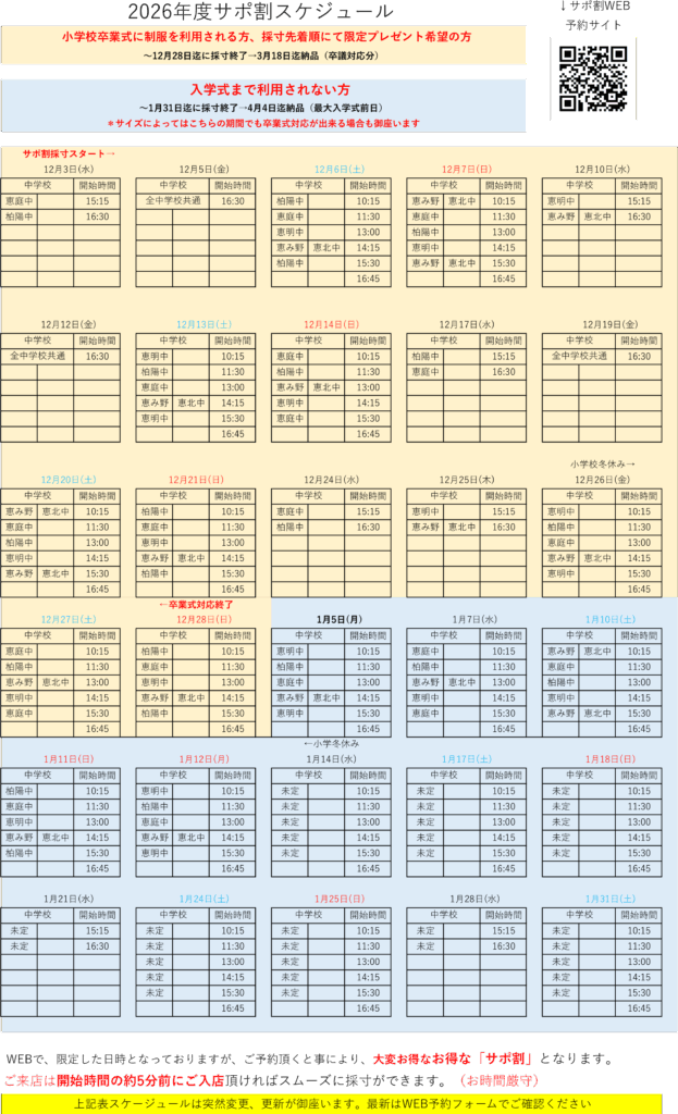 「サポ割」は各中学校別で START日時を指定しており、下記スケージュール(突然変更有)となっております 最新日程は 直接WEB予約サイトから確認できます
