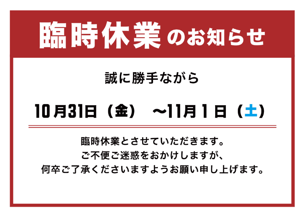 2025.10.30 himonoya コメント: 0 臨時休業 営業案内 臨時休業のおしらせ 2025年10月31日(金) 2025年11月1日(土)の2日間 臨時休業となっております。 11月2日(日)~は通常営業しております。 営業時間10:00~18:00(火曜定休) Tweet Share Hatena Pocket feedly Pin it RSS この記事のタイトルとURLをコピーする 関連記事 営業時間の変更 コメント コメント ( 0 ) トラックバック ( 0 ) この記事へのコメントはありません。 この記事へのトラックバックはありません。 トラックバック URL 返信をキャンセルする。 名前 ( 必須 ) E-MAIL ( 必須 ) ※ 公開されません URL Δ