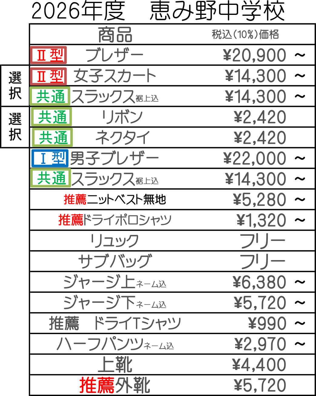 恵み野中学校 Ⅱ型(婦人縫製)制服Ⅰ型(紳士縫製)制服価格表 恵み野中学校恵み野中学校Ⅱ型制服になります。※サイズによって金額が異なる場合がございます。 恵み野中学校恵み野中学校Ⅰ型制服になります。※サイズによって金額が異なる場合がございます。 2026年度価格表